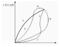 下图为用以展现进度的香蕉曲线图,图中曲线A为最早时间计划,曲线B为最迟时间计划,曲线C、D、E、F为实际进度,( )表示延期。