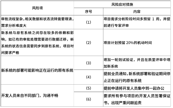 某公司新开发内部审批系统,此系统为原有信息管理系统的扩充,整合原系统中审批相关的处理并将整个公司的审批流程规范化,覆盖公司所有审批业务。公司成立项目组,任命小刘为项目经理小刘参与过公司原信息管理系统的研发,对新项目进行了详细的需求调研,初步拟定了项目计划,将可能遇到的风险总结成了如下风险表,风险表中有风险和风险应对措施两部分内容,并要求项目组严格执行此表直到项目结束。