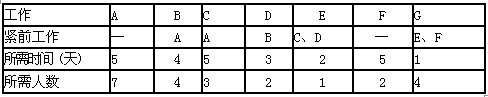 某工程包括A、B、C、D、E、F、G七项工作,各工作的紧前工作、所需时间以及所需人数如下表所示(假设每个人均能承担各项工作)该工程的工期应为(1)天。按此工期,整个工程最少需要(2)人。(1)A. 13B. 14C. 15D. 16(2)A. 7B. 8C. 9D. 10