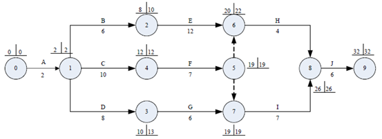 在实施中,承建单位制定了如下图所示的单元测试进度计划, 图中已标出每个节点的最早开始时间和最迟开始时间。监理工程师在第5 天进行检查时,发现工作A 已经完成,工作B 已经实施3 天,工作C 已经实施1 天,工作D 已经实施1 天。