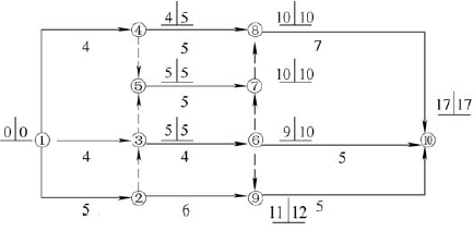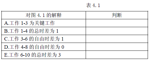 某计算机系统设备安装工程双代号网络计划如图 4.1 所示。该图中已标出每个节点的最早时间和最迟时间,请判断对图4.1 的解释是正确的还是错误的,并填写表4.1(在判断栏中,正确的填写“√”,错误的填写“×”。)
