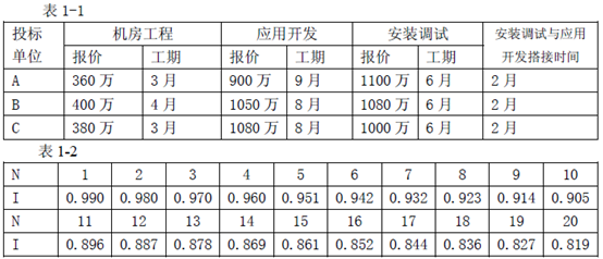 事件1:招标文件中规定:评标采用最低评标价中标的原则;工期不得长于18 个月,若投标人自报工期少于16 个月,在评标时将考虑其给建设单位带来的收益,折算成综合报价进行评标。事件2:投标人C 按照招标文件的要求,将技术和商务标书分别封装,在封口上加盖本单位公章并且由法定代表人签字后,在投标截止日期前1 天上午将投标文件送达招标代理机构。次日(即投标截止日当天)下午,在规定的开标时间前1 小时,投标人C 又向招标人递交了一份补充材料,声明将原来的投标报价降低4%。但是,招标代理机构的有关工作人员认为,根据国际上“一标一投”的惯例,一个投标人不得递交两份投标文件,因而拒绝投标人C 的补充材料。事件3:假如贷款月利率为1%,各单项工程完成后付款,在评标时考虑工期提前给建设单位带来的收益为每月20 万元。三家单位投标书中与报价和工期有关的数据见表1-1(三个单项工程是按照机房工程、应用开发和安装调试顺序进行实施的,表中搭接时间是指后项工程与前项工程的重叠时间,例如投标单位A 应用开发在进行到7 个月的时候,安装调试工作可以开始)。表1-2 是复利现值系数表。