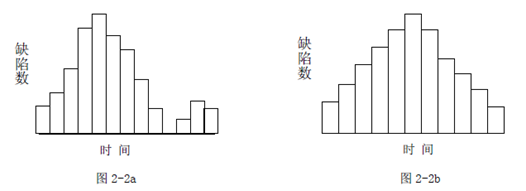 事件3:在软件开发的测试过程中,监理工程师收集了一段期间内通过两轮测试发现的缺陷数据,并画出了直方图(如图2-2a、2-2b 所示)。