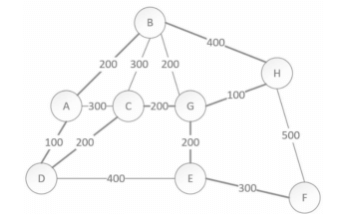 下图为某地区的JRS直播通信线路图,图中节点为8个城市,节点间标识的数字为城市间拟铺设通信线路的长度,为了保持8个城市通讯连接,则至少铺设( )千米的线路。A.1000 B.1100 C.1200 D.1300