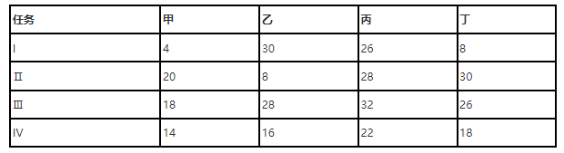 63题: 某企业承接了一项工程,该工作分为Ⅰ、ll、II、Ⅳ四项任务,甲、乙、丙、丁四个项目组完成各项任务的时间如表所示,为实现最优配置,第Ⅳ项任务应由 ( ) 来完成。