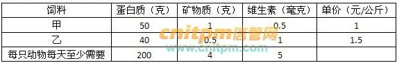 某饲养场饲养了某种动物,每只动物每天至少需要蛋白质200克、矿物质4克、维生素5毫克。市场上销售的甲乙两种饲料每公斤的营养成分及单价如下: 因此,饲养每只动物至少需要饲料成本()元 A、6 B、8 C、10 D、12