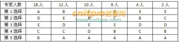 例如,有18位专家对项目的优选排序都是ADECB,依次类推。