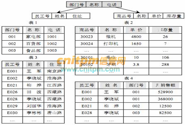 某商场的部门、员工和商品三个实体之间的关系如下图所示。假设每个部门有若干名员工,每种商品只能由一个部门负责销售,那么部门到员工、部门到商品之间分别存在这(1)的联系。如果用户要求得到表4所示的结果,需要(2),并增加关系模式(3)。如果查询某部门负责销售的商品,需要(4)。