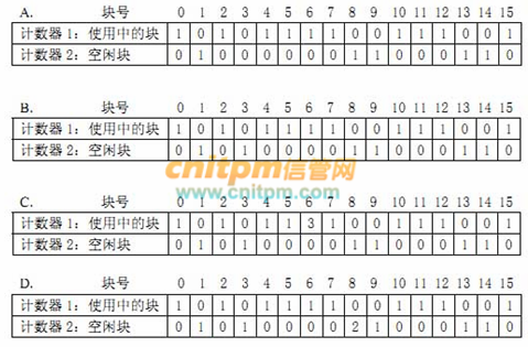 影响文件系统可靠性因素之一是文件系统的一致性问题,如果读取 (1) 的某磁盘块,修改后在写回磁盘前系统崩溃,则对系统的影响相对较大。通常的解决方案是采用文件系统的一致性检查,一致性检查包括块的一致性检查和文件的一致性检查。在块的一致性检查时,检测程序构造一张表,表中为每个块设立两个计数器,一个跟踪该块在文件中出现的次数,一个跟踪该块在空闲表中出现的次数。若系统有16个块,检测程序通过检测发现表 (2) 状态下的文件系统是一致的。