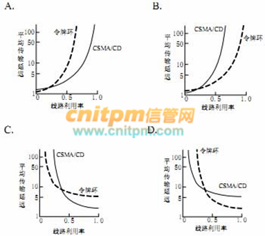 正确地表现了CSMA/CD和令牌环两种局域网中线路利用率与平均传输延迟的关系的图是 ( ) 。 A. AB. BC. CD. D