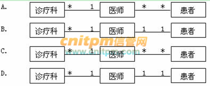 关于诊疗科、医师、患者和治疗观察关系模式如下所示,其中带实下划线的表示主键,虚下划线的表示外键。( )表示上述关系模式的E-R图。图中,* *、1 *、和1 1分别表示多对多、1对多和1对1的联系。 A. AB. BC. CD. D