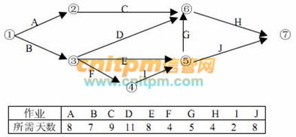 某工程计划图示如下,各个作业所需的天数如下表所列,设该工程从第0天开工,则作业I最迟应在第( )天开工。