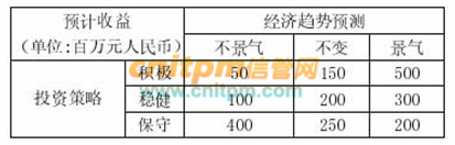 某公司需要根据下一年度宏观经济的增长趋势预测决定投资策略。宏观经济增长趋势有不景气、不变和景气3种,投资策略有积极、稳健和保守3种,各种状态的收益如下表所示。基于maxmin悲观准则的最佳决策是( )。A、积极投资 B、稳健投资 C、保守投资 D、不投资