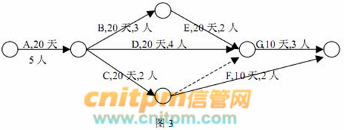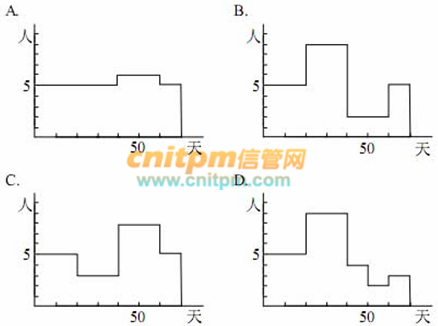 某工程包括7个作业(A~G),各作业所需的时间和人数以及互相衔接的关系如图3所示(其中虚线表示不消耗资源的虚作业): 如果各个作业都按最早可能时间开始,那么,正确描述该工程每一天所需人数的图为 ( ) 。 A. AB. BC. CD. D