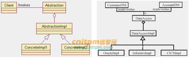下图中左边的UML类图描绘的是设计模式中的 (1) 模式。右边的UML类图描述了该模式的一种应用,其中与左图中的“Abstraction”对应的类是 (2) 。(1)A、Command B、Bridge C、Composite D、Proxy(2)A、DataAccess B、DataAccessImpl C、CustomerDM D、AccountDM