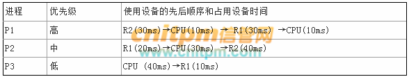 在一个单CPU的计算机系统中,有两台外部设备R1、R2和三个进程P1、P2、P3。系统采用可剥夺式优先级的进程调度方案,且所有进程可以并行使用I/O设备,三个进程的优先级、使用设备的先后顺序和占用设备的间如下表所示: