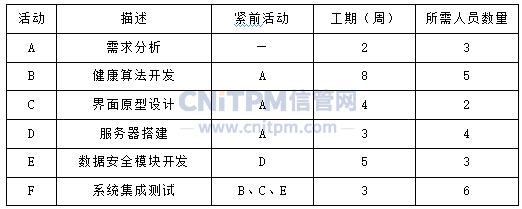 某医疗大数据公司基于机器学习技术正在研发糖尿病风险预测系统,由10名开发人员组成的项目团队,需在六个月内完成全流程开发,并推进项目商业落地,项目活动关键信息如下表: