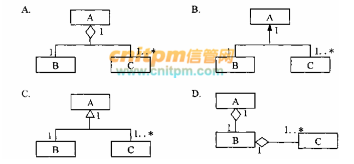 已知3个类A、B和C,其中类A由类B的一个实例和类C的1个或多个实例构成。能够正确表示类A、B和C之间关系的UML类图是( )。 (1)A. AB. BC. CD. D