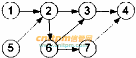 拓扑序列是无环有向图中所有顶点的一个线性序列,图中任意路径中的各个顶点在该图的拓扑序列中保持先后关系,( )为—下图所示有向图的一个拓扑序列。 A、1 2 3 4 5 6 7 B、1 5 2 6 3 7 4 C、5 1 2 6 3 4 7 D、5 1 2 3 7 6 4