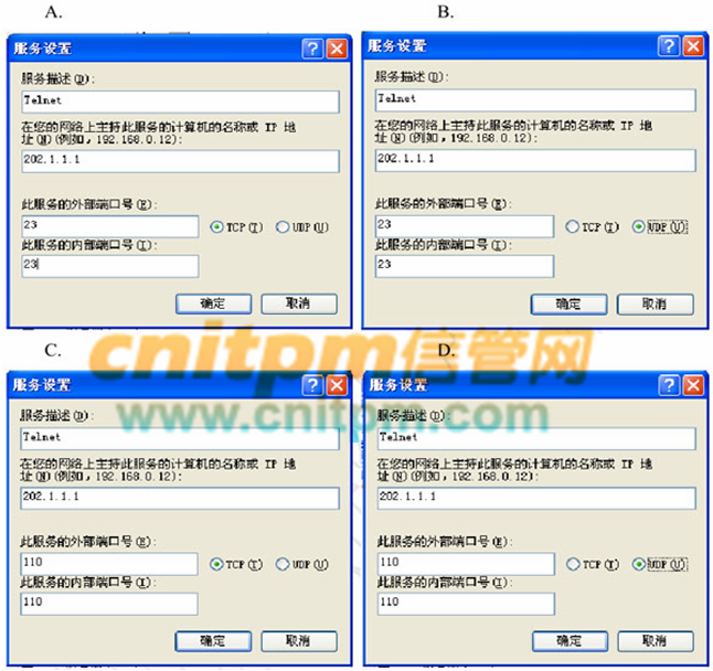 如果希望别的计算机不能通过 ping 命令测试服务器的连通情况,可以 (1) 。如果希望通过默认的 Telnet 端口连接服务器,则下面对防火墙配置正确的是 (2) 。(2)