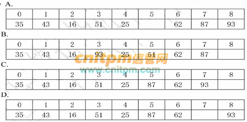 已知一个线性表(16, 25, 35, 43, 51, 62, 87, 93),采用散列函数 H(Key)=Key mod 7将元素散列到表长为 9 的散列表中。若采用线性探测的开放定址法解决冲突(顺序地探查可用存储单元),则构造的哈希表为  (1)  ,在该散列表上进行等概率成功查找的平均查找长度为  (2)  (为确定记录在查找表中的位置,需和给定关键字值进行比较的次数的期望值称为查找算法在查找成功时的平均查找长度)。