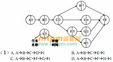 若一个项目由 9 个主要任务构成,其计划图(如下图所示)展示了任务之间的前后关系以及每个任务所需天数,该项目的关键路径是 (1) ,完成项目所需的最短时间是 (2)天(1)A. AB. BC. CD. D