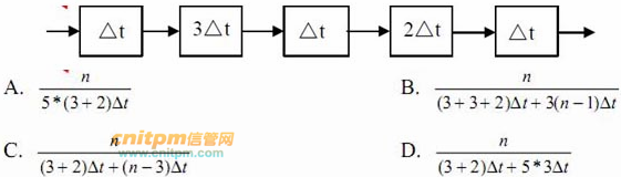 某指令流水线 5 段组成,第 1、3、5 段所需要时间为△t,第 2、4 段所需时间分别为 3△t、2△t,如下图所示,那么连续输入 n 条指令时的吞吐率(单位时间内执行的指令个数)TP 为( )。 A. AB. BC. CD. D