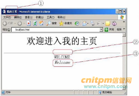 下图是 HTML 文件 test.html 在 IE 中的显示效果,实现图中①处效果的 HTML 语句是(1),实现图中②处效果的 HTML 语句是(2),实现图中③处效果的 HTML 语句是(3) A. AB. BC. CD. D