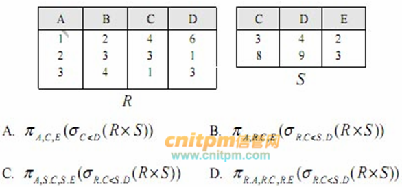 若关系 R 、 S 如下图所示,则关系代数表达式π1,3,7(σ3<6(R×S))与()等价 A. AB. BC. CD. D