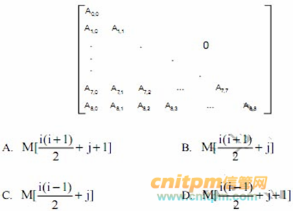 设有如下所示的下三角矩阵A[0..8,0..8],将该三角矩阵的非零元素(即行下标不小于列下标的所有元素 )按行优先压缩存储在数组(0 ≤i ≤8, j ≤i )存储在数组M的( ) 中。 A. AB. BC. CD. D