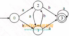 下图所示的有限自动机中,0 是初始状态,3 是终止状态,该自动机可以识别 ( ) 。 A、abab B、aaaa C、bbbb D、abba