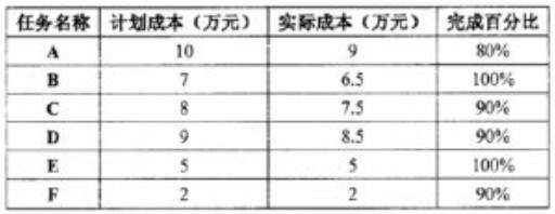 某项目经理将其负责的系统集成项目进行了工作分解,并对每个工作单元进行了成本估算,得到其计划成本。第四个月底时,各任务的计划成本、实际成本及完成百分比如下表: