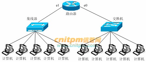 在下图的网络配置中,总共有 (1) 个广播域, (2) 个冲突域。 (1)A、2 B、3 C、4 D、5(2)A、2 B、5 C、6 D、10