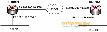 网络配置如下图所示,为路由器Router1配置访问以太网2的命令是 ( ) 。