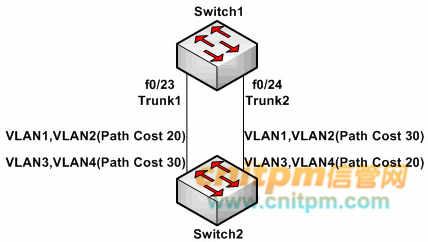 如果两个交换机之间设置多条Trunk,则需要用不同的端口权值或路径费用来进行负载均衡。默认情况下,端口的权值是 (1) 。在如图的配置下, (2) 。