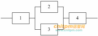 某系统的可靠性结构框图如下图所示。该系统由4个部件组成,其中2、3两个部件并联冗余,再与1、4部件串联构成。假设部件1、2、3的可靠度分别为0.90、0.70、0.70。若要求该系统的可靠度不低于0.75,则进行系统设计时,分配给部件4的可靠度至少应为( ) 。
