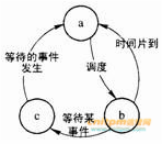 假设系统中进程的三态模型如下图所示,图中的a、b和c的状态分别为 ( ) 。