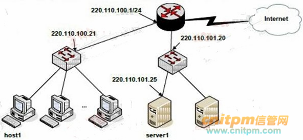 某网络拓扑如下图所示,在主机host1上设置默认路由的命令为 (1) ;在主机host1上增加一条到服务器server1主机路由的命令为 (2) 。