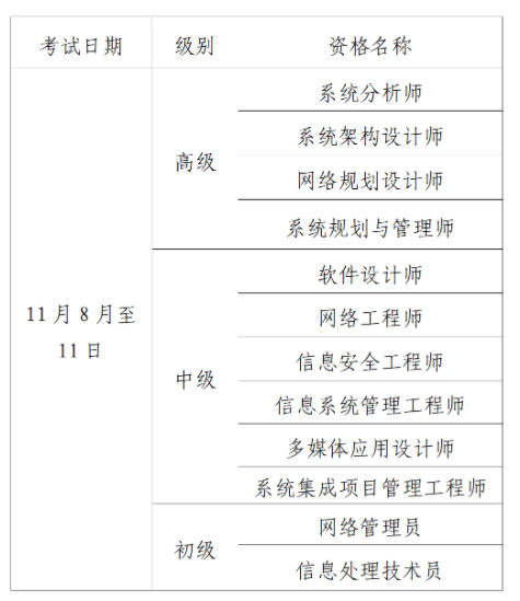 (一)2025年计算机软件资格考试采取计算机化考试方式,考试设置初、中、高三个级别。下半年考试日期为 11月8日、9日、10日、11日,具体时间以准考证为准。请报考人员做好时间安排,考试工作安排详见2025年计算机技术与软件专业技术资格(水平)考试工作安排。(见附表)。