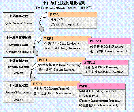 个体软件过程(PSPSM:personal software process)由美国卡内基·梅隆大学软件工程研究所的汉弗莱(Watts S.Humphrey)等人开发而成,并于1995年推出,着重于软件开发人员的个人培训、品质改善和工数估算,既是软件能力成熟度从组织转向个人的飞跃,也是软件工程从定向转为定量的标志。CMM难以适用于小规模的软件开发组织,而PSP为软件开发者提供了控制、管理和改进个人工作方式的个人过程框架,弥补了CMM并未提供的有关实现CMM关键过程域所需的具体知识和技能,与CMM、TSP(team software process)构成比较完善的CMM·PSP·TSP体系。PSP过程由一系列方法、表单、脚本等组成,指导软件开发人员如何确保自己的工作品质,如何估算和规划自身的工作,如何度量和跟踪个人的表现,如何改善自身的软件流程和品质。PSP能够提供:说明个体软件过程的原则;软件工程师作出准确的计划;软件工程师为改善产品质量需要采取的步骤;度量个体软件过程改善的基准;流程的改变对软件工程师能力的影响。PSP进化框架概要如图5-2所示,其中个体度量过程(PSP0)是PSP的开始。