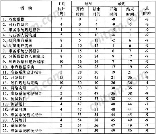 在这个客户关系管理项目中,表4中最后一项活动“准备系统转换报告”的最早结束时间和项目要求完工时间之间有9天的差距,这个差距叫做“总时差”,有时也叫“浮动量”。总时差可以用每项活动的最迟结束(开始)时间减去它的最早结束(开始)时间算出,即: