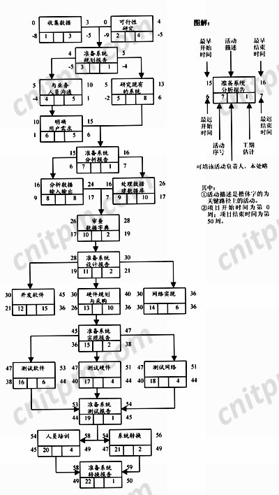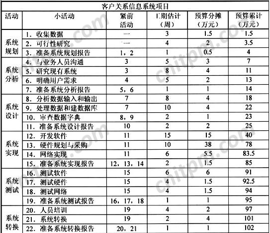 由于客户关系信息系统整个项目的总时差为-9,也就是说,开发本项目需要59周,而不是合同规定的50周。我们从表3中也看到项目各活动预算分摊累计的最后结果是102万元,而不是合同规定的100万元。