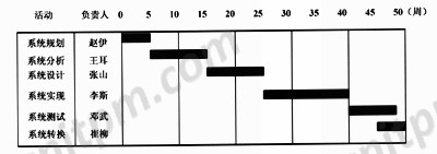 根据相关的责任矩阵,项目经理绘制了项目的甘特图(图1)。图中将该项目划分为六大活动,并明确了各活动的工期:系统规划(5周)、系统分析(10周)、系统设计(10周)、系统实现(15周)、系统测试(8周)和系统转换(5周)。