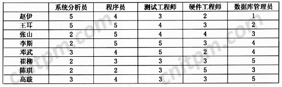 首先,我们可以绘制技术编制表(表1),为项目组人员打分,其方法是按照对专业领域的熟悉程度打分。例如,将专业领域分为五个:系统分析员、程序员、测试工程师、硬件工程师、数据库管理员,并将最高分定为5分。随后根据每个成员对上述专业领域的熟悉程度打分,熟悉程度越高,打分越高。如此一来,就可以对项目组人员及技术状况一目了然,并据此分配工作。