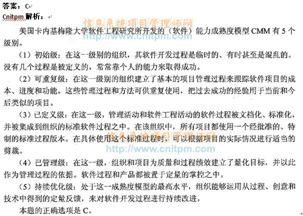 CMM是美国卡内基梅隆大学软件工程研究所开发的(软件)能力成熟度模型,其中()强调软件开发过程稳定性与项目量化管理。