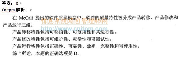 在软件质量模型中,比较有代表性的有MCCALL提出的软件质量模型。在这个质量模型中,软件的质量特性被分成了三组,即产品转移、产品修改和()