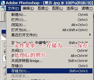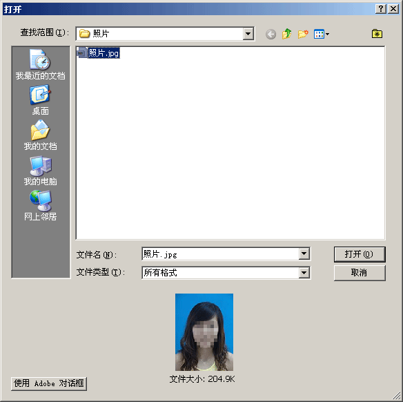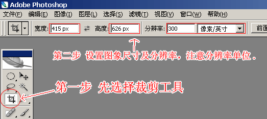 1.打开Adobe PhotoShop软件,建议使用9.0及以上版本. 2.文件菜单-->打开(如图) 3.选择要处理的照片 4.选择PhotoShop的裁剪工具 5.设置裁剪工具的属性,设置为: 宽415像素,长626像素;分辨率为300像素/英寸 6.拖动鼠标,在照片中选择合适的大小. 7.拖动裁剪框,到合适的位置.按回车键确认照片 8.在文件菜单中选择存储为,保存处理后的照片. 9.输入文件名后,选择文件格式为JPG格式,点击保存按钮. 10.在JPEG选项对话框内,拖动调整块,设置文件大小为50kb左右,点击确定按钮,照片处理完成