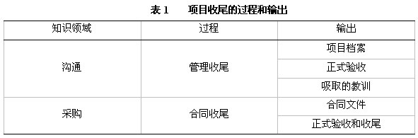 下表列出了项目收尾过程的知识领域、过程和输出,它表明了项目收尾的主要内容。