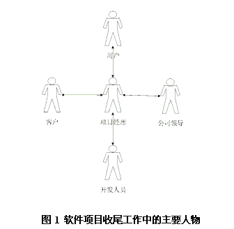 从上图可以看出,项目经理处于中心位置,是收尾工作中的关键人物,由他来协调项目干系人的各种关系。用户是软件的使用者,客户是软件项目资金的付出者,是软件合同中的甲方,开发人员是项目班子中的成员,公司领导是项目收尾工作的有力支持者。
