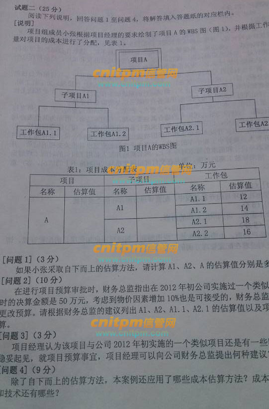 今年题目难的,除了论文被猜中外,上午题目不是很确定,两可题目很多,都是综合性题目,下午案例第一题就会挂掉不少人,而且第一题设计不少陷阱,很多人中招了,一个是12周,一个是13周,靠,还要考虑进度,计算又是小数,完蛋。
